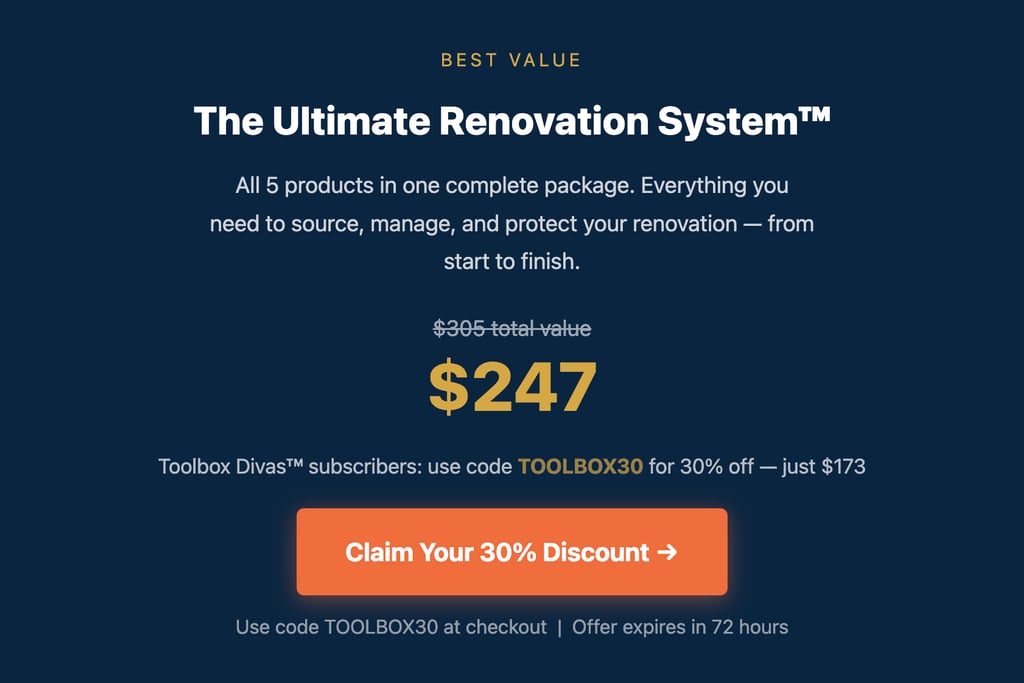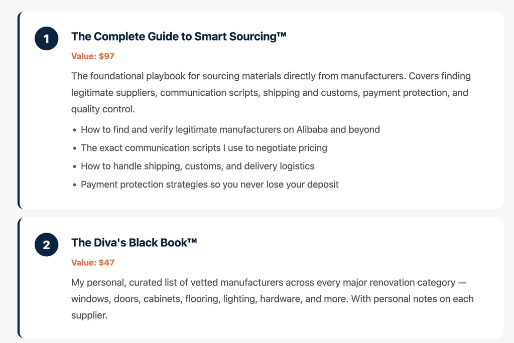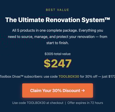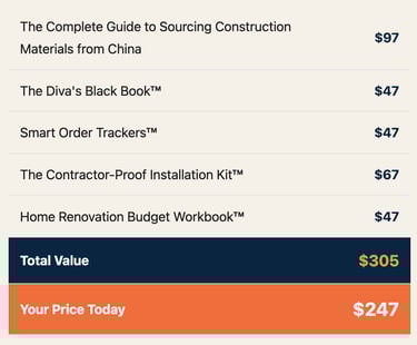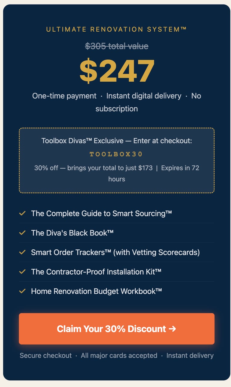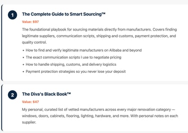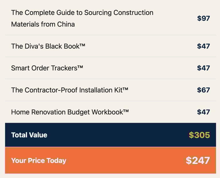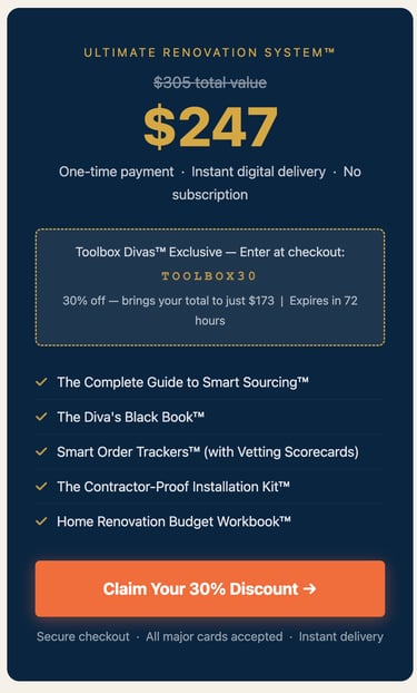 The Smart Sourcing Diva™ system gives you the exact tools, contacts, and step-by-step process to source materials directly, vet contractors, and protect every dollar of your renovation budget.